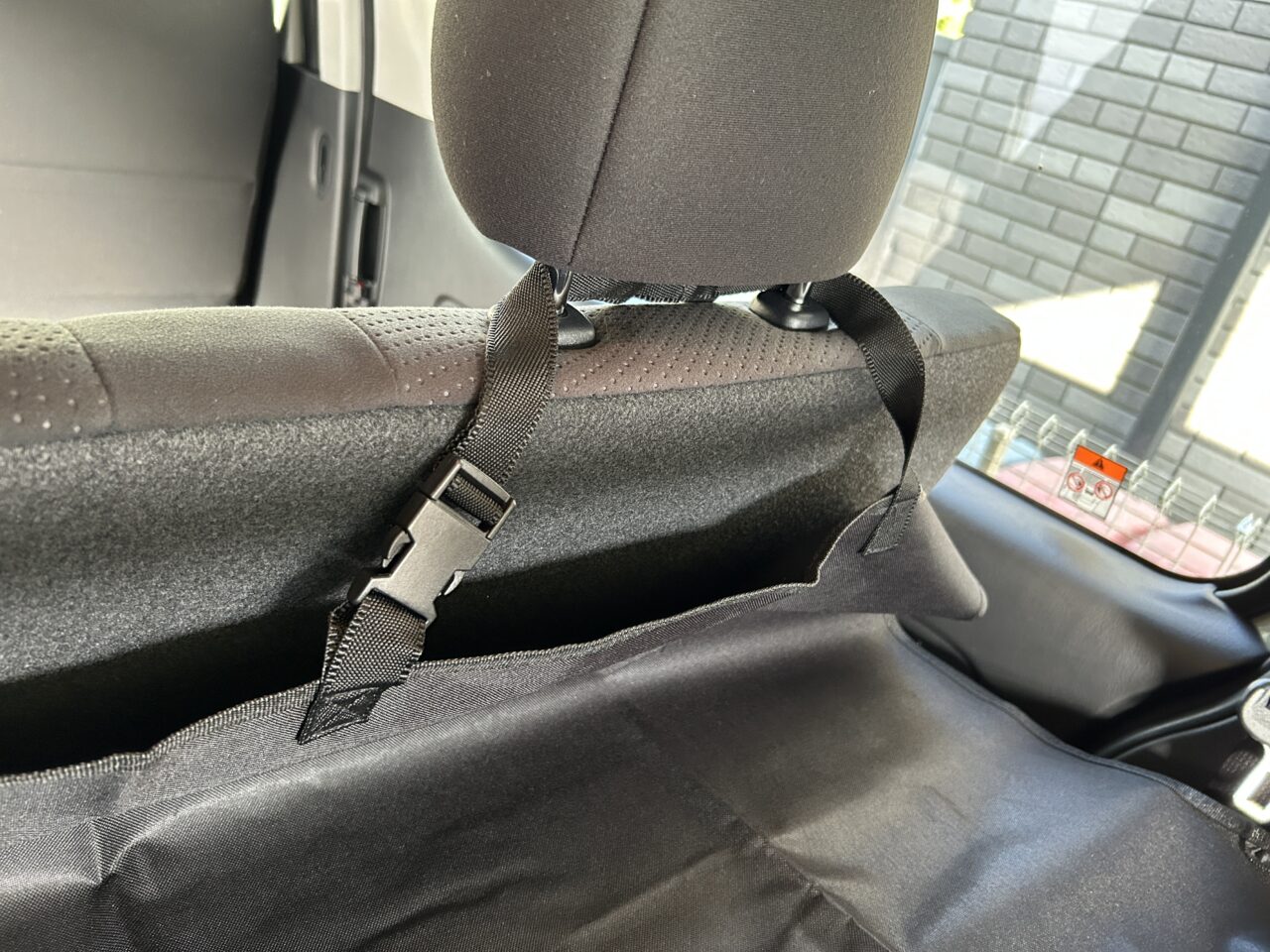 後部座席のヘッドレストにストラップをかけバックルで固定します。