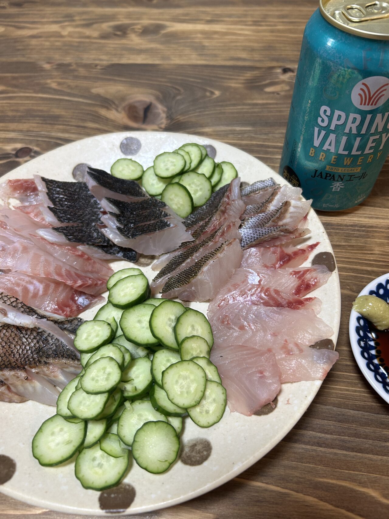 初めて釣ったイサキと同行していた友人にもらったオナガでお造りしました。