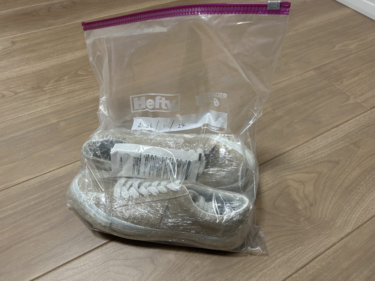 ラップを巻いたスニーカーをフリーザーパックに入れます。
