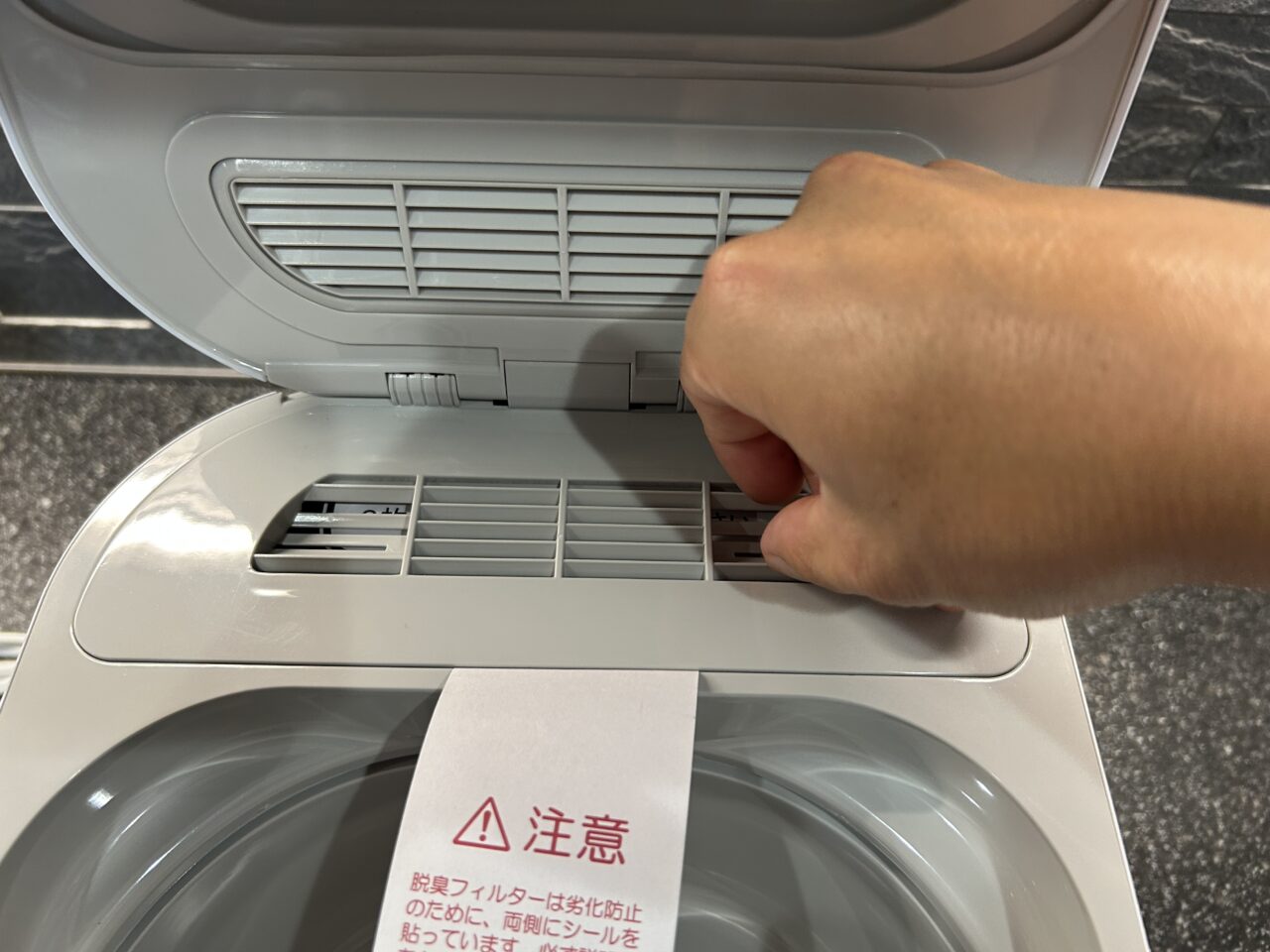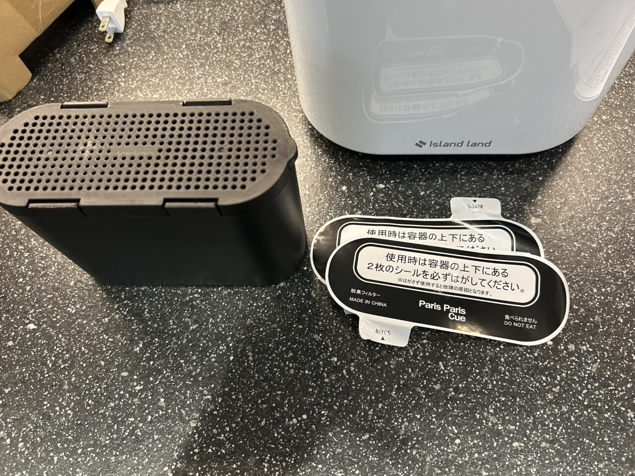 ここに脱臭フィルターが入っているので取り出して上下に付いている2枚のシールを剥がします。